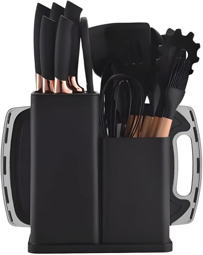 طقم متكامل 18 قطعة: سكاكين متعددة الأحجام، أدوات طهي سيليكون، مقص مطبخ، لوحات تقطيع، وأدوات خفق